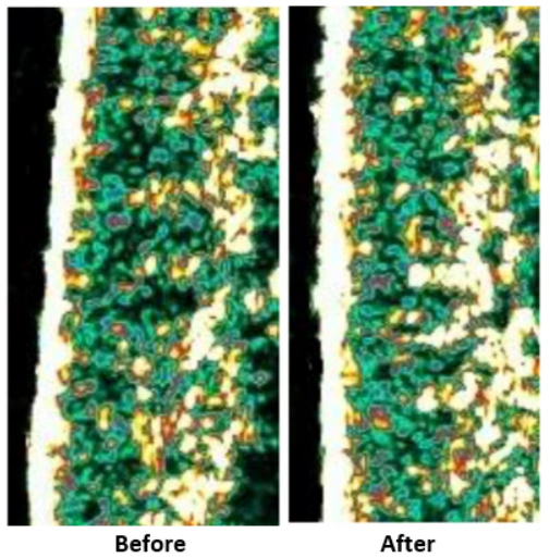 The Dermatology Center also used ultrasound technology to assess the density of the skin. The more white spots there are, the denser the skin, and in the pictures here we see the obvious tightening of the skin after the Hair, Skin & Nails treatment.