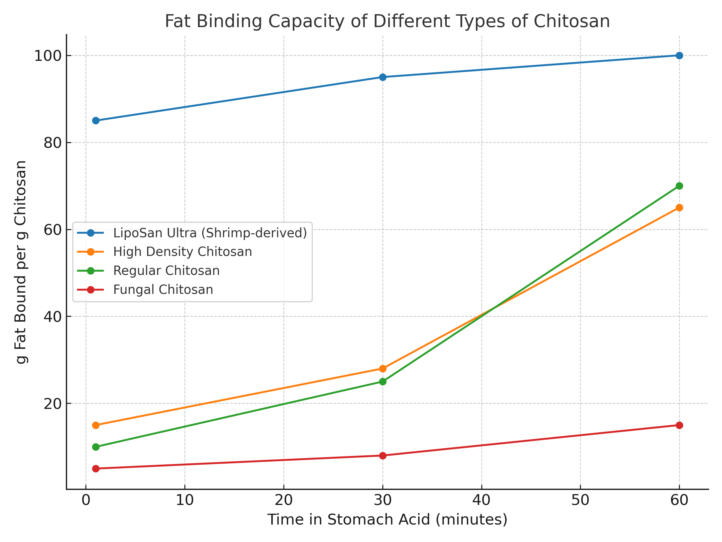 Lab tests simulating digestion show that LipoSan Ultra® binds notably more triglycerides than standard chitosan—and much more efficiently within a short time frame. Clinical findings support this too: users taking 3 g/day of LipoSan Ultra® experienced measurable weight loss compared to placebo under a non-restrictive diet.